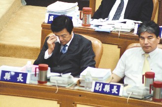 臺北縣長周錫瑋(左)30日談及臺中縣市合并“升格”案時落淚表示,該案進(jìn)度如果超前臺北縣“升格”案,將辭去縣長職務(wù)。(圖片來源:臺灣《聯(lián)合報》)