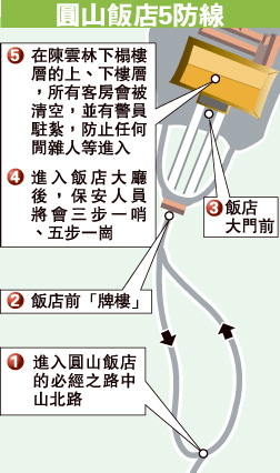 圓山飯店地形位居臺北的小山丘上,具保安優(yōu)勢。據(jù)悉,為阻絕綠營方抗議民眾可能靠近飯店,警方會在陳云林訪臺期間,在飯店內(nèi)外設(shè)置5道關(guān)卡,其中在門外設(shè)置三道防線(見示意圖),最外圍是進(jìn)入圓山飯店唯一入口前的中山北路,這里距離飯店約500米,而飯店前的“牌樓”則是第二道關(guān)卡,距飯店大廳約200米。