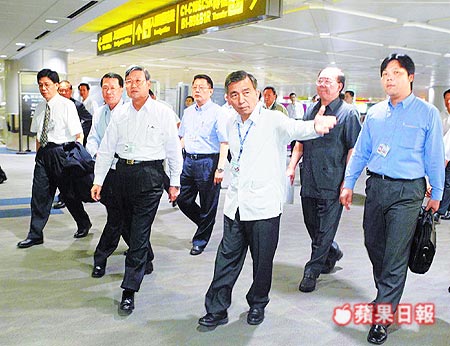 海協(xié)會常務副會長鄭立中一行20人31日晚抵達桃園機場,維安人員把兩條封鎖線隔出的走道占滿,整個隊伍延綿數(shù)十公尺。