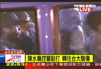陳水扁今天深夜10點(diǎn)45分左右坐車前往臺(tái)大醫(yī)院驗(yàn)傷(臺(tái)灣TVBS圖)