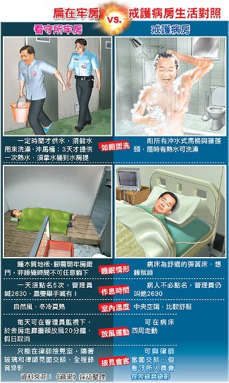 陳水扁在看守所與戒護(hù)病房生活對(duì)比(來源:臺(tái)灣《蘋果日?qǐng)?bào)》)