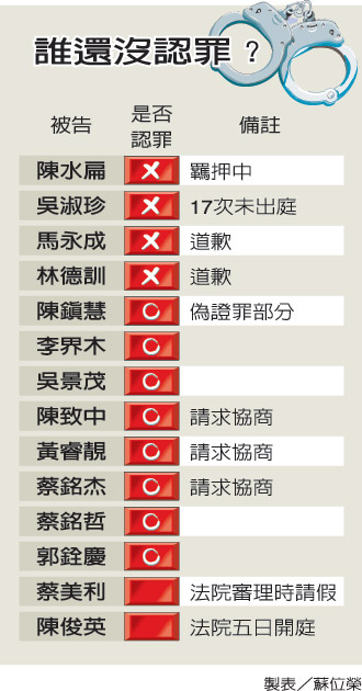 中新網(wǎng)2月5日電 據(jù)臺灣媒體報道,臺北地方法院繼續(xù)開庭審理陳水扁家族四大案,今天上午陸續(xù)傳訊前力麒建設(shè)董事長郭銓慶與吳淑珍的嫂嫂、被告陳俊英,兩人庭上均認罪。至此,扁案被告中已有九人認罪。