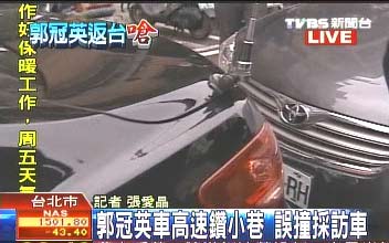 之后,郭冠英座車抵達臺北市區(qū),在媒體車輛的跟拍下,發(fā)現(xiàn)郭冠英的座車在臺北市大小街頭繞來繞去,并未前往“新聞局”也未返家,似乎想要把記者跟車甩掉。郭冠英座車甚至一度和緊跟的媒體采訪車在臺北醫(yī)學院附近發(fā)生輕微擦撞,由于人車并無大礙,郭冠英車輛隨即再度駛離,并繼續(xù)在臺北街頭亂逛。