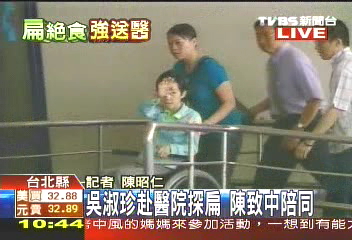 中新網5月11日電 據臺灣TVBS報道,陳水扁因為絕食身體虛弱遭到強制送醫(yī),目前仍在臺北縣立板橋醫(yī)院接受治療。陳水扁夫人吳淑珍偕同兒子陳致中11日上午來醫(yī)院特見陳水扁。