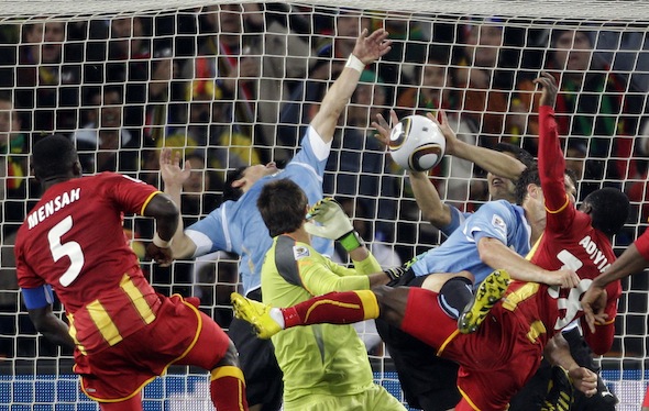 加納隊(duì)與烏拉圭隊(duì)的世界杯1/4決賽,可謂是一波三折。在加時(shí)賽的最后關(guān)頭,加納隊(duì)險(xiǎn)些攻破烏拉圭隊(duì)的大門,不過烏拉圭隊(duì)的前鋒蘇亞雷斯卻上演上帝之手,將皮球拍了出去。他的這個(gè)違反體育精神的舉動(dòng),卻給烏拉圭隊(duì)帶來了一線生機(jī),在加納隊(duì)前鋒吉安罰丟點(diǎn)球后,烏拉圭隊(duì)在點(diǎn)球大戰(zhàn)中4比2淘汰加納。