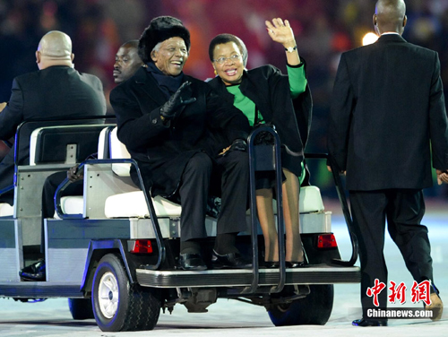 中新網(wǎng)7月12日電 在今天凌晨0:45,南非世界杯閉幕式在約翰內(nèi)斯堡足球城球場拉開帷幕,而南非前總統(tǒng)、91歲的曼德拉也出現(xiàn)在了閉幕式場邊。