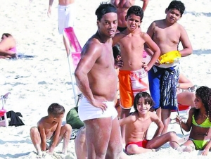 因?yàn)榇饲癆C米蘭一直對他能否留隊(duì)舉棋不定,世界杯又被鄧加拋棄,小羅只好自己去尋開心,他先是相約帕托等人在奢華酒店享受,隨后又到里約熱內(nèi)盧沙灘玩耍。只是他忘了給自己的大肚腩遮羞,臃腫的身材似乎正在向大羅看齊。