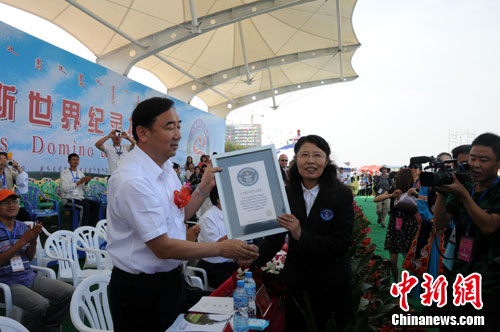 今天的活動(dòng)打破了新加坡在2000年9月30日由9234名學(xué)生在圣陶沙島西樂(lè)索海灘創(chuàng)造的人體多米諾吉尼斯世界紀(jì)錄。經(jīng)過(guò)最終的檢查和確認(rèn)后,新的紀(jì)錄正式生效,吉尼斯世界紀(jì)錄認(rèn)證官吳曉紅向鄂爾多斯市長(zhǎng)云光中頒發(fā)了吉尼斯世界紀(jì)錄證書。