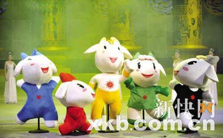 “五羊”是廣州市最為知名的一個(gè)標(biāo)志,以五只羊作為吉祥物,充分體現(xiàn)了東道國(guó)、主辦城市的歷史底蘊(yùn)、精神風(fēng)貌和文化魅力。這五只羊有著與北京奧運(yùn)會(huì)吉祥物“北京歡迎你”類似的名字,“阿祥”、“阿和”、“阿如”、“阿意”、“樂(lè)羊羊”組成“祥和如意樂(lè)洋洋”。