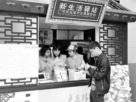 昨天下午當班的黃洪丹,是廣東交通職業(yè)學(xué)院的大二學(xué)生,也是同行8人的班長。她為記者一一介紹了站內(nèi)各種方便設(shè)施,告訴記者今天短短幾個小時,她們已經(jīng)接待了100多位前來咨詢的朋友,“就是剛才,我們剛給一大幫外國朋友指了去亞運村的路呢!