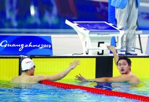 作為廣州亞運(yùn)會(huì)第一個(gè)火炬手,同時(shí)又被譽(yù)為“泳池中的劉翔”,張琳(右)昨日無(wú)緣領(lǐng)獎(jiǎng)臺(tái)著實(shí)意外。本報(bào)特派記者 吳江 攝