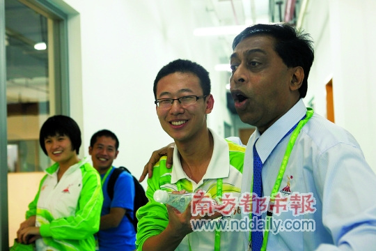 結(jié)果本該短短兩分鐘的路程,我們竟然走了大半天。因?yàn)楣芬怀鲩T看見一位中國(guó)志愿者小伙子臉上沒笑容,就摟著他說:“嘿,你干嘛不笑一笑,你看上去比我還老。”然后他就摟著這個(gè)志愿者問記者:“我年輕還是他年輕?”記者識(shí)趣地回答:“當(dāng)然是您!彼_心地哈哈大笑。原以為就到此結(jié)束了,忽然走來一位頭發(fā)已花白的馬來西亞隊(duì)官員,哈利姆立刻放開志愿者小伙子,摟住這位老人家,然后又問一遍記者:“我年輕還是他年輕?”
