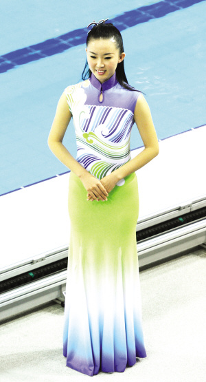 藍(lán)綠和黃綠交織,間或一抹白色,亞運(yùn)頒獎小姐的禮服,有一個好聽的名字,叫做“行云流水”。穿在身上,能勾勒出禮儀小姐玲瓏婀娜的身段,展現(xiàn)別有一番韻味的東方美。