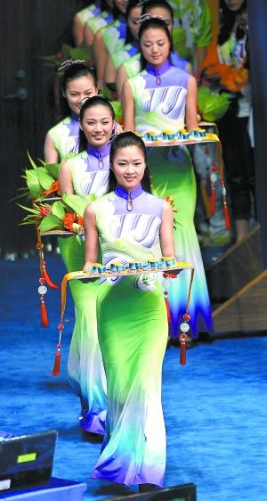 藍(lán)綠過渡的明亮色,將云水紋完美展示的同時,也將禮儀小姐們婀娜的身姿盡情展示。舉手投足間,禮儀小姐們顯得典雅而華麗。現(xiàn)場觀眾在把掌聲獻(xiàn)給獲獎運動員的同時,也將目光聚集在了這些禮儀小姐們的身上。