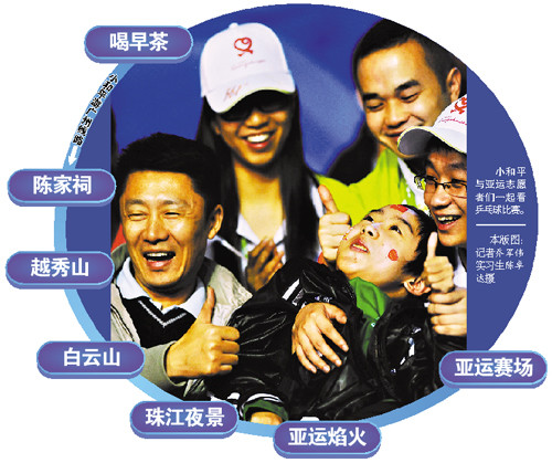 他叫徐和平,是一位受廣州企業(yè)家資助從四川地震災(zāi)區(qū)來穗治病的少年(見本報11月10日A21版和11日A19版相關(guān)。十多天前,得知他治愈無望,志愿者通過本報呼吁:在小和平返鄉(xiāng)前,請熱心廣州人當(dāng)導(dǎo)游,領(lǐng)著他逛逛花城、感受亞運氣息。這一刻,在廣州亞運會的賽場上,小和平的夢想都實現(xiàn)了。