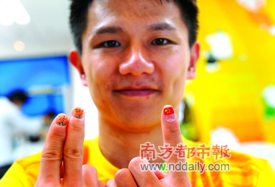14日中午,記者在運(yùn)動(dòng)員村國(guó)際區(qū)采訪時(shí)偶遇了陳一冰。剛吃完午飯的他,徑直走進(jìn)了位于國(guó)際區(qū)A區(qū)一樓的美發(fā)室。美甲師陳琳告訴記者,陳一冰的左右手食指上原本就涂了圖案,左手是五星國(guó)旗,右手是個(gè)“冰”字,下面還加了個(gè)“No.1”。