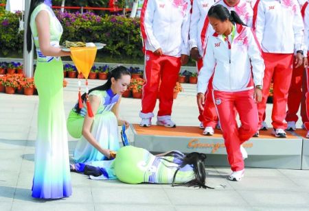 龍舟這一本屆亞運會新增項目昨天首秀,所有人都充滿了好奇。無數(shù)記者涌向龍舟比賽場,見證這歷史性的時刻。不過誰也沒有想到,一次在場外發(fā)生的小小意外,卻吸引了所有人的關(guān)注——龍舟比賽頒獎儀式,一名手捧銀牌的禮儀小姐突然暈倒在地,手中的銀牌悉數(shù)落在地上。