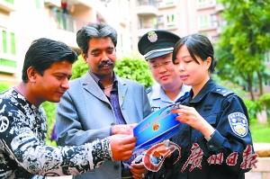 兩名警察正向來自孟加拉的兩兄弟講解亞運(yùn)期間治安知識。記者邵權(quán)達(dá) 攝