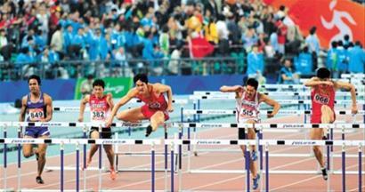 昨天,劉翔(中)奪得亞運會男子110米欄三連冠。