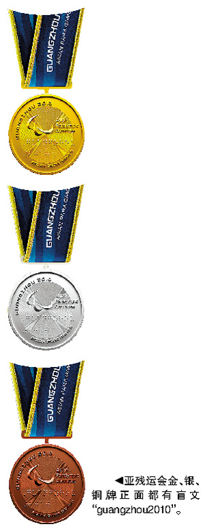 亞殘運(yùn)會獎牌的正面與亞運(yùn)會獎牌的正面設(shè)計(jì)不同,亞運(yùn)會獎牌的正面設(shè)計(jì)主題是“亞奧理事會會徽+廣州市花紅棉”,而亞殘運(yùn)會獎牌的正面不僅設(shè)計(jì)有會徽,更有獨(dú)特的盲文設(shè)計(jì)。