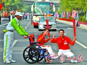 昨日上午,廣州2010年亞洲殘疾人運動會廣州火炬?zhèn)鬟f活動在花城廣場拉開帷幕,8.8公里的路途上,共有98名火炬手參與傳遞活動,包括21名殘疾人士。他們中既有杰出的殘疾運動員,也有各行各業(yè)的優(yōu)秀殘疾人代表,還有默默耕耘的志愿者和廣州亞運會中奪冠的體育健兒,做出積極貢獻的各方面人士。