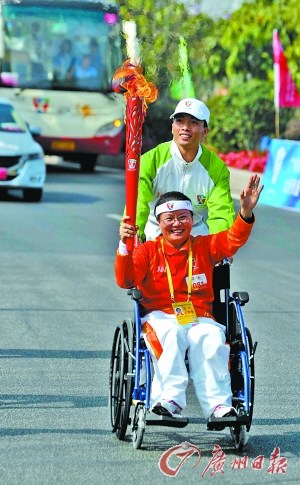 來自韶關(guān)南雄的馬麗蕓曾獲得2009年東亞運動會冠軍,2010年第五屆亞錦賽冠軍,還是國內(nèi)唯一代表中國參加2008年北京奧運會女子小輪車比賽的運動員。馬麗蕓表示,亞運會參賽運動員和亞殘運會火炬手的雙重身份對于她來說很是光榮,“我預(yù)祝這屆亞殘運會取得圓滿成功”。