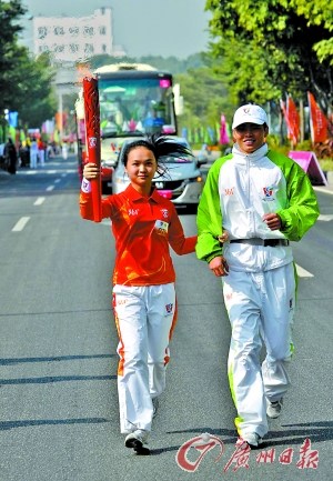 上午11時20分,最后一棒火炬手,剛剛獲得第16屆亞運會小輪車女子越野比賽冠軍的馬麗蕓高舉著“潮流”出現(xiàn)在員村五橫路親水廣場的紅地毯上。