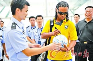 羅納爾迪尼奧在白云機(jī)場(chǎng)為工作人員簽名。