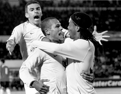 法比亞諾(中)和隊(duì)友小羅(右)、盧西奧慶祝進(jìn)球。