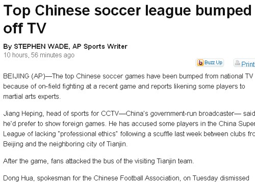 美聯(lián)社文章稱,中國足球的頂級聯(lián)賽已經(jīng)被“踢出”國家電視臺的節(jié)目單,因為最近接連不斷的球場暴力,在媒體報道中甚至被稱作“武術(shù)選手”。文章援引了央視體育頻道總監(jiān)江和平的說法稱,他更希望播出外國的體育節(jié)目!白罱谐(lián)賽非;靵y,有一些球員缺乏職業(yè)素質(zhì),”他指的是上周北京國安和天津泰達(dá)隊的比賽中,兩隊球員爆發(fā)了群毆事件,賽后一些球迷還襲擊了客場作戰(zhàn)的天津隊的大巴。