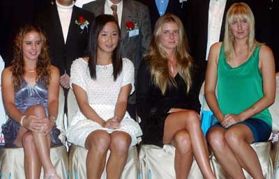 香港網(wǎng)球精英賽昨天在維多利亞公園中央場(chǎng)拉開戰(zhàn)幕。在前晚的賽前酒會(huì)上,彭帥和莎拉波娃等人坐到了一起,爭(zhēng)奇斗艷。(左起:彭帥、漢圖楚娃、莎娃)