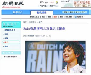 據(jù)前日的《朝鮮日報》報道稱,韓國藝人Rain(鄭智熏)獲邀演唱北京奧運主題曲。朝鮮日報報道稱:“據(jù)悉,北京奧委會2007年曾向Rain發(fā)出邀請,希望他能夠演唱奧運主題曲。……Rain欣然接受了邀請,目前正在與北京奧委會(注:應(yīng)為北京奧組委)方面談具體事宜!
