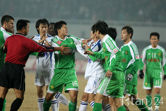 11月12日,北京國(guó)安與天津泰達(dá)賽后,雙方爆發(fā)斗毆,黃博文(16號(hào))與對(duì)方毆打。