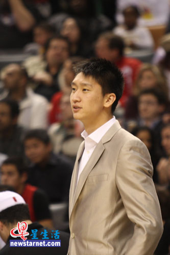 身著西裝的孫悅更多的時(shí)間只是靜靜地坐在場(chǎng)邊觀戰(zhàn)。只是在比賽暫停期間,他才起身與隊(duì)員一起傾聽主教練對(duì)比賽的部署。在中國孫悅是一個(gè)很有實(shí)力的球員,但在NBA卻不得不從板凳上站起。