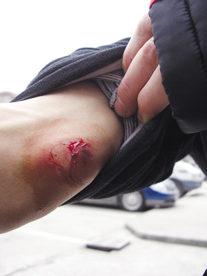 賽后,記者找到了被咬的甘肅選手葉爾蘭別克·卡泰,在隊(duì)友的陪伴下,他正在隊(duì)醫(yī)處給傷口上藥。記者現(xiàn)場可以看到,杯口大的傷口上兩排牙印十分明顯,雖然已經(jīng)經(jīng)過隊(duì)醫(yī)的處理,但是傷口還在往外滲血。一旁陪伴他的隊(duì)友心痛地說:“咬得也太狠了吧,以前我們從來沒遇到過這種事情,太惡劣了!”葉爾蘭別克·卡泰告訴記者,當(dāng)時(shí)被咬了以后自己疼得立刻泄了氣,比賽也沒辦法繼續(xù)下去,反而被對(duì)手扳倒取勝,自己心里“實(shí)在咽不下這口氣”。但是考慮到下午還有比賽,加上結(jié)果已經(jīng)無法改變,他也只好接受這個(gè)事實(shí)。