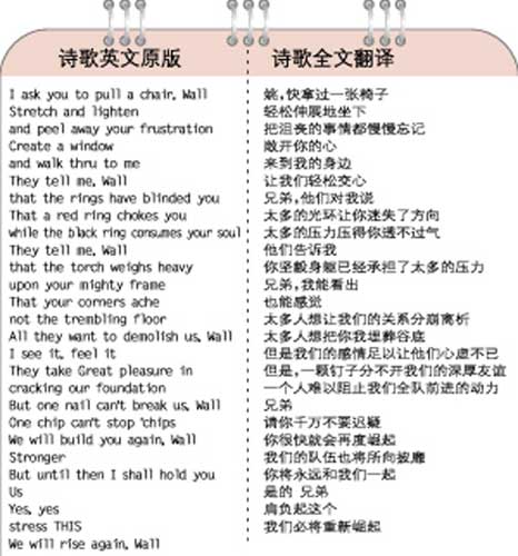 盡管這首詩是不是麥蒂親筆所寫,目前還沒有得到最終的確認。但詩中的這種濃濃的兄弟之情,正是火箭隊全隊目前所需要的。在沒有姚明的情況下,火箭隊只有團結(jié)一心,努力奮斗,才能向著球隊的目標一步步邁進。