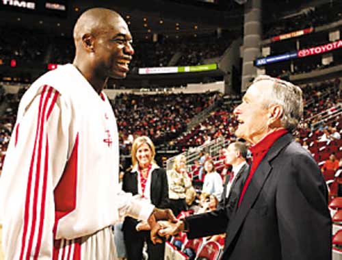 穆大叔的親密戰(zhàn)友姚明、弗朗西斯都拄著拐杖到場支持,見證這一光輝時刻!值得注意的是,就連美國前總統(tǒng)老布什也親臨現(xiàn)場,為穆大叔送祝福。而斯特恩則親自為穆托姆博頒獎。在頒獎慶典上,火箭老板亞歷山大代表火箭隊,向穆托姆博醫(yī)院捐贈50萬美元,這也是對這位令人尊敬的老將的一份獎勵。