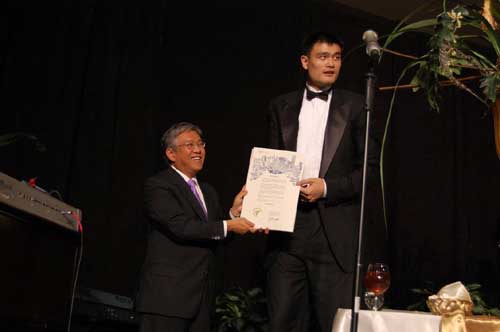 在晚宴中間,休斯頓市長(zhǎng)比爾-懷特的代表、前市議員關(guān)振鵬講話宣布,比爾-懷特市長(zhǎng)頒發(fā)特別文告,命名4月17日為姚明日(Yao Ming’s Day)。