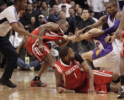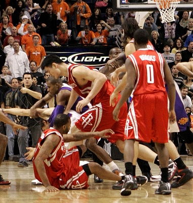 從洛杉磯倉皇逃離,來到鳳凰城的火箭需要一劑神奇的療效藥,幸運(yùn)的是,他們昨晚得到了,火箭的全體球員都恢復(fù)得很好,他們最終以94比82擊敗太陽。有意思的是,最大限度刺激球迷神經(jīng)的不是經(jīng)典的“姚鯊對決”,也不是奧尼爾超越哈夫里切克成為歷史得分王第十,更不是麥迪的27分,而是阿爾斯通引發(fā)的群毆。這場群毆幾乎囊括了在場的全部10名球員,最終導(dǎo)致2人被罰出場、3人吃到技術(shù)犯規(guī)。