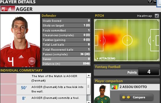 對于喀麥隆隊的比賽,盡管對手在比賽中大部分時間內(nèi)都在圍繞著丹麥隊的球門狂轟濫炸,但是阿格協(xié)助門將索倫森力保大門不被輕易攻破。除了埃托奧在開場后10分鐘利用隊友的失誤而打入一球,其他的比賽時間里,阿格鎮(zhèn)守的大門固若金湯,即便喀麥隆隊將丹麥隊的防線乃至索倫森的十指關(guān)打穿,阿格也仍然是一到不可逾越的防線,將皮球破壞出危險范圍。