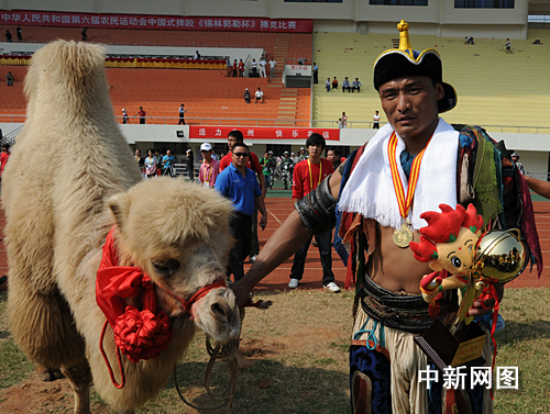圖為身著傳統(tǒng)摔跤服裝的內(nèi)蒙古選手巴雅爾巴特爾牽著獎品白駱駝走出賽場。