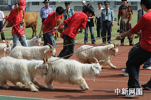 “今早明明還很乖,我還帶它在場地里散步吃草呢!睗M頭大汗的志愿者小陳終于“拽”住了還在“意猶未盡”到處亂蹦的山羊。據(jù)小陳介紹,這些是本應(yīng)在女子搏克頒獎式上作為獎品出場的羊。“估計它們沒見過什么大場面,又被這么多相機的閃光嚇得要命,再加上今早天氣很熱,所以就‘造反’了!