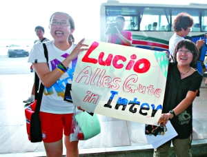現(xiàn)場(chǎng)還有兩位女球迷顯得非常安靜,她們手上的自制海報(bào)寫著“Lucio Alles Gute in Inter(盧西奧,在國(guó)米一切順利)”,還高舉著拜仁的球衣,當(dāng)盧西奧現(xiàn)身時(shí),其中一位女球迷狂叫著“盧西奧”的名字,飛奔至國(guó)米大巴邊,被兩位保安攔下。