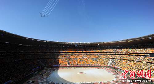 中新網(wǎng)6月11日電 隨著羅伯特凱利演唱起本屆世界杯主題曲《勝利的召喚》,南非世界杯開(kāi)幕式正式落下了帷幕。一個(gè)多小時(shí)之后的22:00,本屆世界杯的揭幕戰(zhàn)就將在這個(gè)體育場(chǎng)打響,東道主南非隊(duì)將迎來(lái)小組賽的首個(gè)對(duì)手、中北美勁旅墨西哥。
