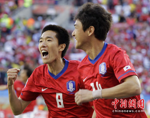 中新網(wǎng)6月12日電 北京時(shí)間19點(diǎn)30分,南非世界杯B組小組賽拉開戰(zhàn)幕,由“太極虎”韓國隊(duì)迎戰(zhàn)歐洲勁旅希臘隊(duì)。第7分鐘韓國隊(duì)由李正秀先拔頭籌,下半場開場后樸智星利用對方后衛(wèi)的一次失誤將全場比分鎖定為2-0。