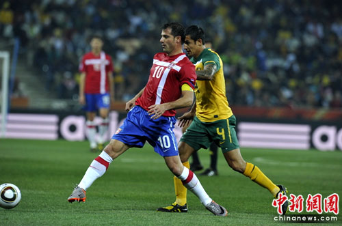 中新網(wǎng)6月24日電 今天凌晨,南非世界杯D組進(jìn)行了最后一輪的較量。塞爾維亞在內(nèi)斯普雷特的姆伯貝拉體育場迎戰(zhàn)澳大利亞隊(duì)。雖然澳大利亞2-1擊敗塞爾維亞隊(duì),但仍然因?yàn)閮魟偾蛄觿莶粩臣蛹{,無緣小組出線。