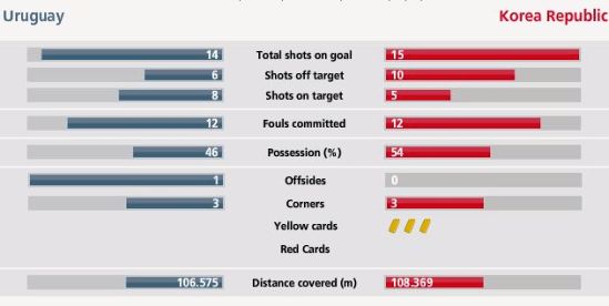 韓國隊在場上更加咄咄逼人,他們的犯規(guī)次數(shù)和烏拉圭隊都是12次,但是韓國隊因為侵犯對手吃到三張黃牌。烏拉圭隊有一次越位,兩隊的角球都是3個,旗鼓相當(dāng)。