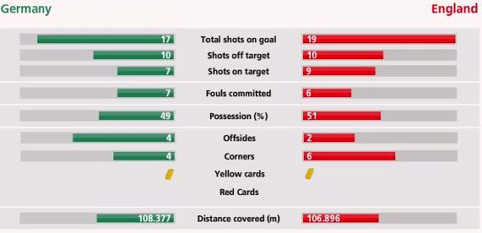雖然這兩大宿敵巔峰對(duì)決,但是兩隊(duì)場(chǎng)上卻表現(xiàn)得相對(duì)和平友好,本場(chǎng)比賽,德國(guó)隊(duì)只有7次犯規(guī),英格蘭隊(duì)也只有6次犯規(guī)。另外兩隊(duì)各有一張黃牌。