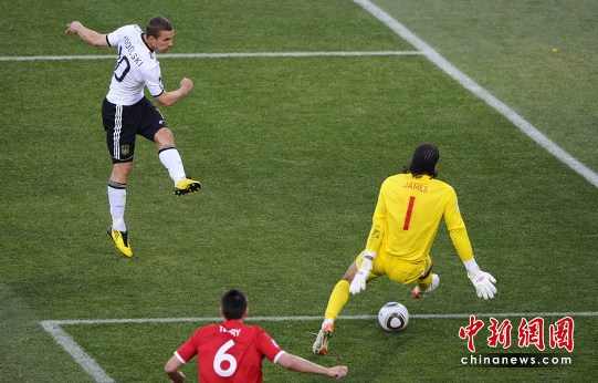 事實證明,比賽從開場哨音響起的那一刻就注定了這將是一場史詩般的對決。生死冤家在稍微試探之后開始對攻大戰(zhàn),擁有鋼鐵意志的日耳曼戰(zhàn)車以簡潔高效的打法率先發(fā)難。第20分鐘,門將諾伊爾大腳將球開至前場,克洛澤擠住英格蘭防守隊員面對出擊的門將詹姆斯右腳冷靜捅射破門,這是克洛澤第99次代表國家隊出賽打入的個人第50粒入球。