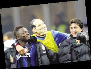 能在9人應戰(zhàn)、裁判判罰也不大利于自己的情況下取勝,國米球員們賽后當然也顯得興奮異常,隊長薩內蒂向球迷致敬,不少藍黑球員圍抱在一起跳舞唱歌,更為搞笑的是,國米替補鐵衛(wèi)馬特拉齊,再度發(fā)揚自己惹是生非、挑釁對手的風格,居然戴上了一副不知道從哪里搞來的AC米蘭主席貝盧斯科尼的面具,來嘲諷這位丑聞不斷的意大利總理。盡管不能上場,但大馬善于嘲弄與惡搞對手的頑劣本性,依舊是沒有改變。而AC米蘭球迷與球員,在看到自己的球隊主席與老板,慘遭對手惡搞,只能是恨得牙癢癢,又無可奈何。